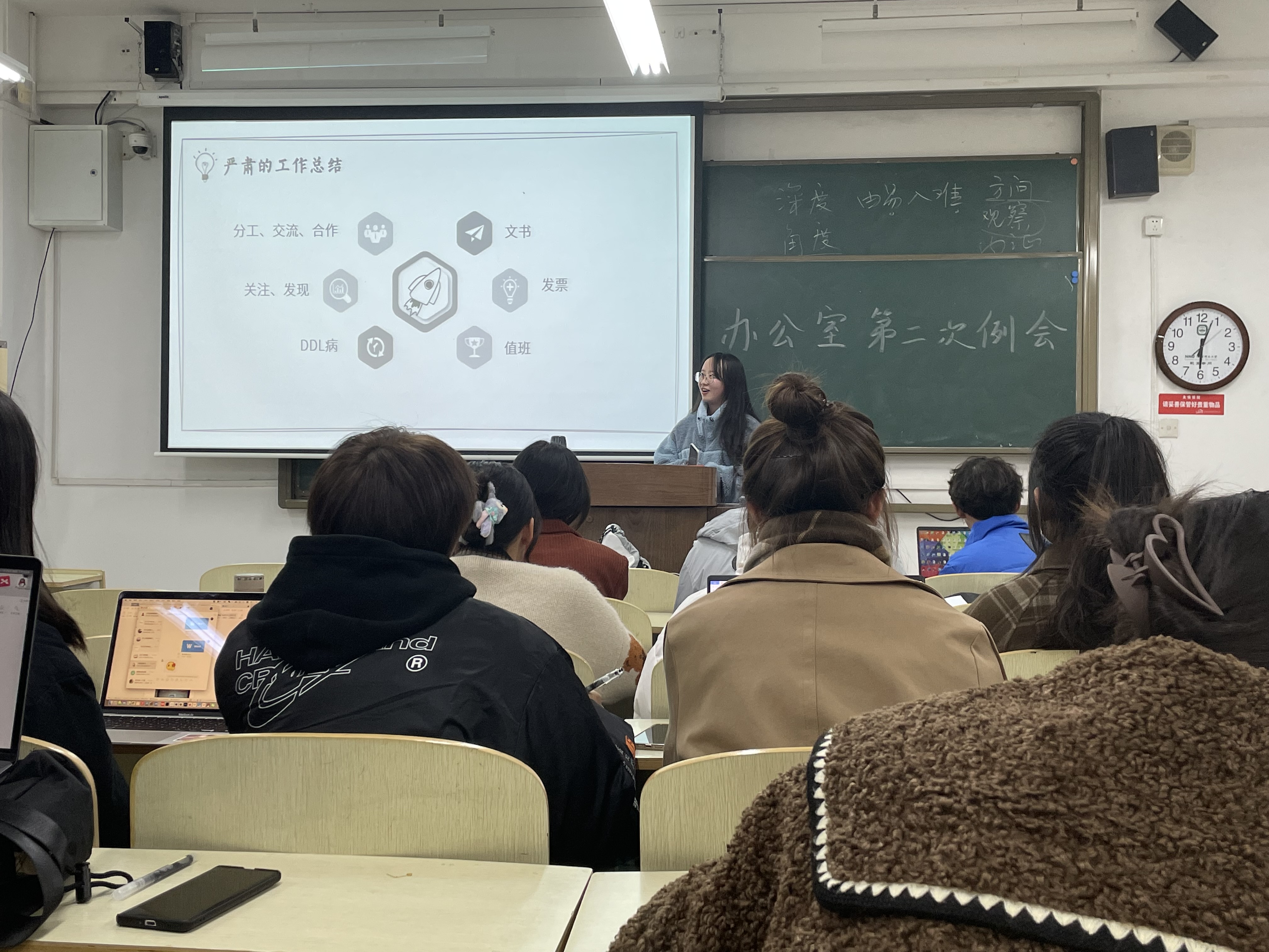 学生会办公室2021~2022学年第一学期第二次部门例会于学正楼103教室正式召开。颜庭婷主席、刘艺涵主任、林佳蓓副主任、王午豪副主任、张云龙副主任出席,办公室11名干事参与会议。本次会议由办公室主任刘艺涵主持。