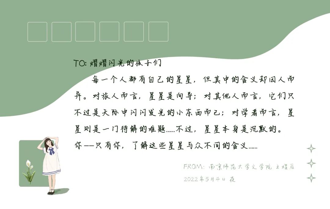 在此次活动开展过程中,同学们都有着极高的热情,积极踊跃参与投稿,内容充实丰富,形式多种多样,充分展现了同学们对山区留守儿童的关心与爱护。投稿作品有精心绘制的明信片,图文并茂,以图绘出美好愿景,以文传递真心祝愿;有真情流露的手写信,字里行间满是关心与爱护之情;有温馨暖心的视频,通过影音这一具体形象的方式,鼓舞激励着山区留守儿童,告诉他们始终有人爱着他们,关心着他们;还有笔力遒劲的书法作品,“宝剑锋从磨砺出,梅花香自苦寒来”,寄托着同学们对留守儿童的美好祝愿。每一份稿件的背后都饱含着同学们对山区留守儿童深深的关心,美好的祝愿以及殷切的期盼,希望通过这一份份作品向山区留守儿童传递爱与温暖。