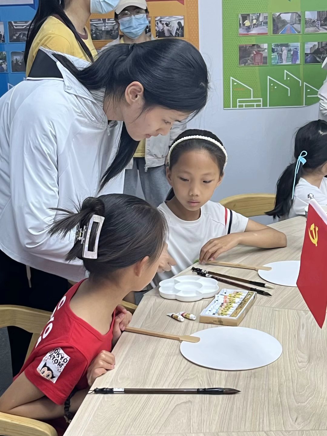 活动开始前,志愿者们提前准备好了所需物资,并精心布置现场:将毛笔浸泡润湿、调和颜料、摆放团扇、调试好PPT和熟悉讲解词。