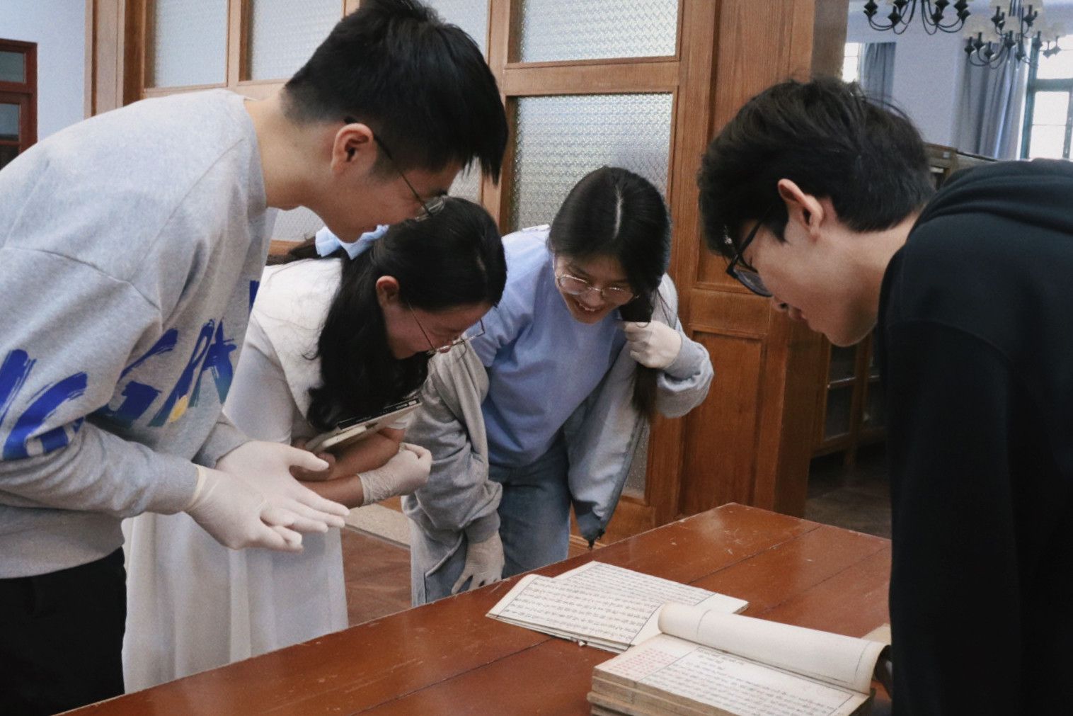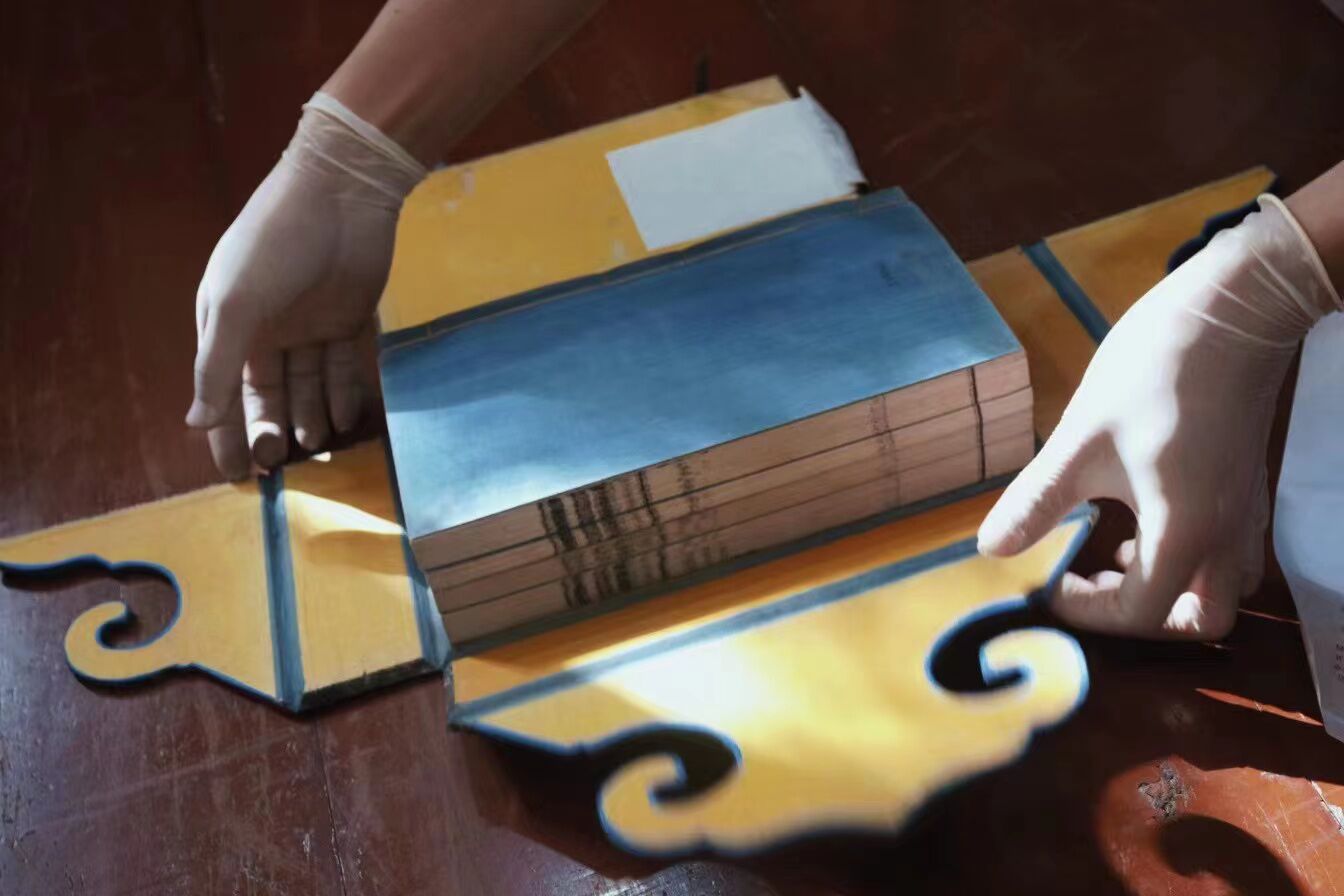资料室内,各式珍贵古籍已被整齐地摆放在桌面。井老师选取了资料室具有代表性的十一种古籍,形式上囊括了木刻本、套印本、活字本、抄本,展现官刻本、家刻本、坊刻本等不同刻书主体的特点。同学们在老师们指导下小心翻阅、近距离观察古籍,联系理论,结合实际,大大拓宽了眼界。