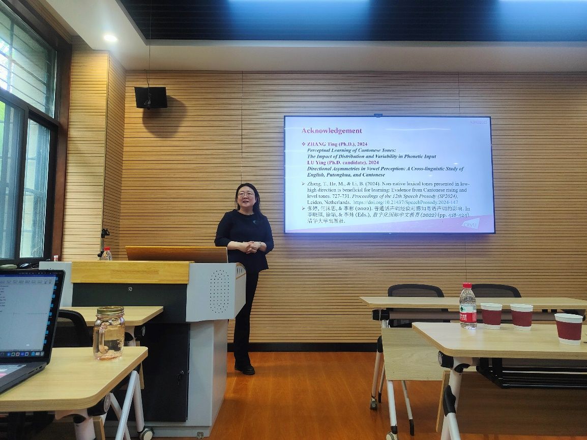 本次讲座中,李老师首先介绍了语音感知的不对称现象:人类在音位识别过程中存在不对称性,对某一些音位识别比较快,对一些音位识别比较慢。李老师重点介绍了Dispersion-focalization理论和Vowel Dispersions理论,特别强调/a/、/i/、/u/是最大化发音位置的三个元音,是最好辨识的元音,因此是世界上所有语言中最普遍的三个元音。不过,声调感知的并不符合Vowel Dispersions理论,存在明显的不对称性。在具体的实验研究中,李老师从粤语和普通话的特点出发,结合个体的语言经验考察了声调的感知不对称性。讲座过程中,李老师现场演示了实验材料,大家的感知倾向和李老师的研究结果完全一致。李老师认为声调感知不对称性体现的高低顺序,是因为人类对降调有更好的感知能力。