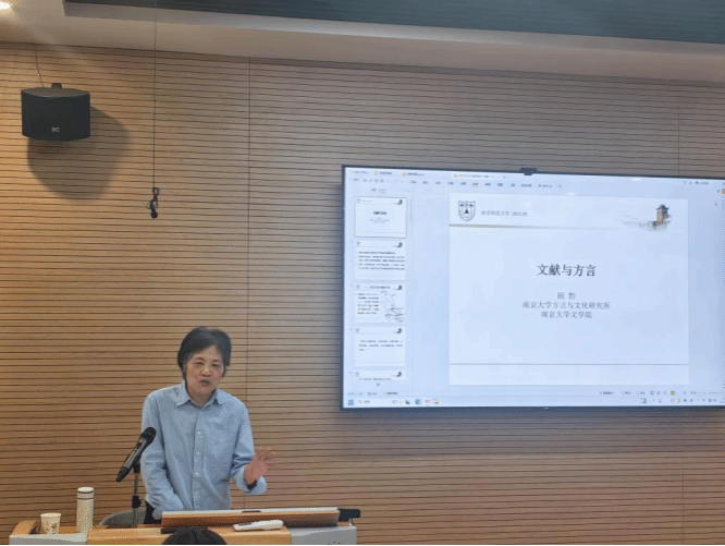 讲座过程中, 顾黔教授系统阐述了田野调查与历史文献结合的研究方法。她以清代文献记载的通泰方言语音特征为例,结合具体历史语料与现存方言的对应关系,深入解析了文献考据与方言实证的互证机制。讲座还通过官话地区文献中记载的特殊语音演变案例,揭示了汉语语音发展过程中呈现出的阶段性演变规律,展现了历时文献与共时方言材料在音韵研究中的互补性价值。顾教授还提到,历史方言是方言研究不可或缺的重要资源,利用古代韵书、辞书等文献中的方言材料进行历时比较,可以揭示方言的早期面貌,并借此重建方言演变的历史轨迹。她同时嘱咐同学们,未来的研究材料获取途径会更为丰富,大家更要把握好机会,通过各类文献材料使研究更扎实、论证更充分。