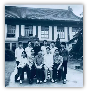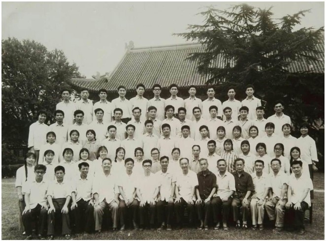 第一排左起:钟陵(古代文学),李灵年(明清小说),郁炳隆(群众文艺),胡震亚(元曲),陆协新(外国文学),盛思明(系党总支书记),曹济平(系主任,古代文学),金启华(诗经,楚辞,唐诗),钱震夏(当代文学),陈振国(现代文学),于满川(中学语文教学法),庄长元(文艺理论),甘竞存(现代文学-鲁迅作品),赖先德(文学概论)